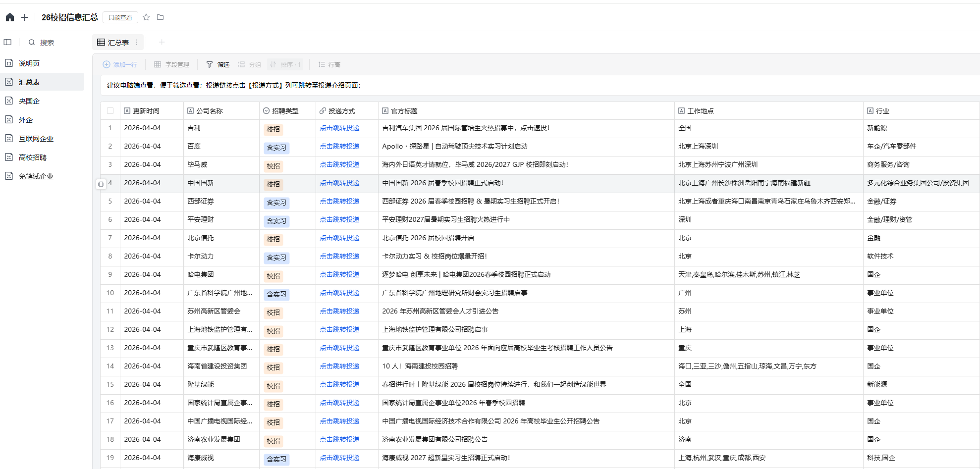 全网最新校招信息一手汇总表,每日实时更新,当天发布的招聘公告第一时间同步收录,告别全网零散翻找、信息滞后错过的烦恼!不用再蹲守各个官网、公众号、招聘平台,不用怕优质岗位刚发布就被淹没,你打开表格就能精准掌握最新岗讯,比同龄人快一步锁定机会、快一步完成投递